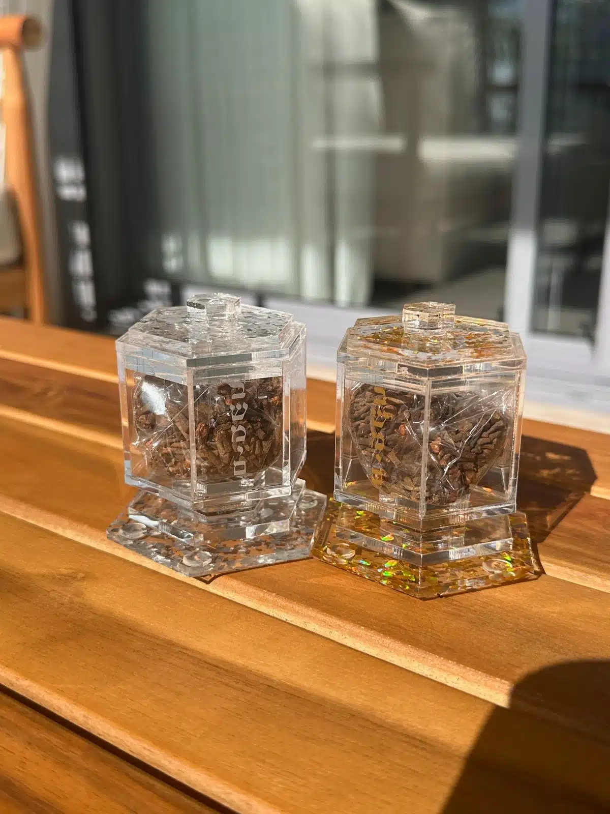 Fragrance Holder made of perspex with glitter, available in silver and gold, height 7.5 cm.