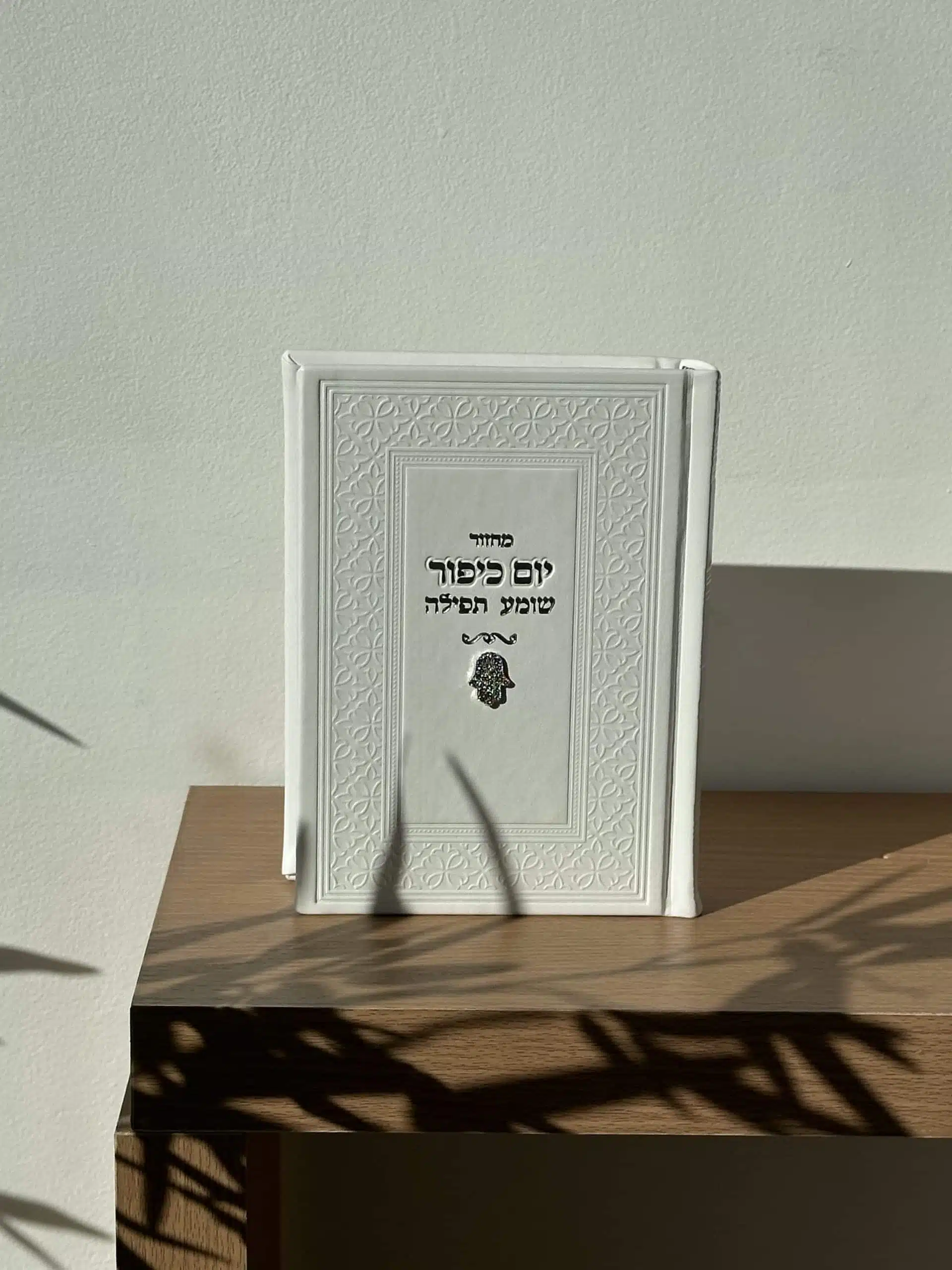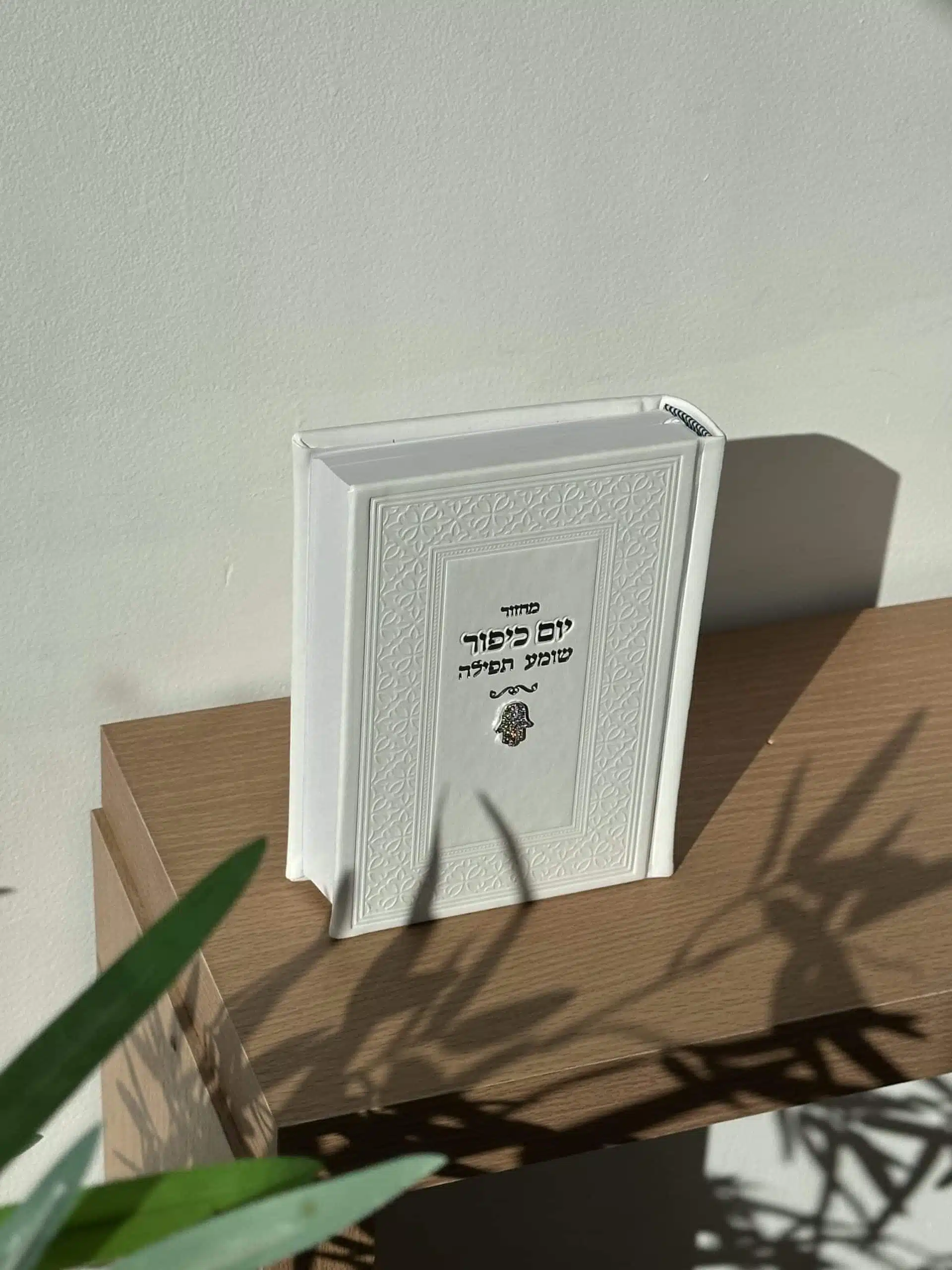 Yom Kippur Machzor, white color, Hamsa charms, height 17 cm, width 12 cm.