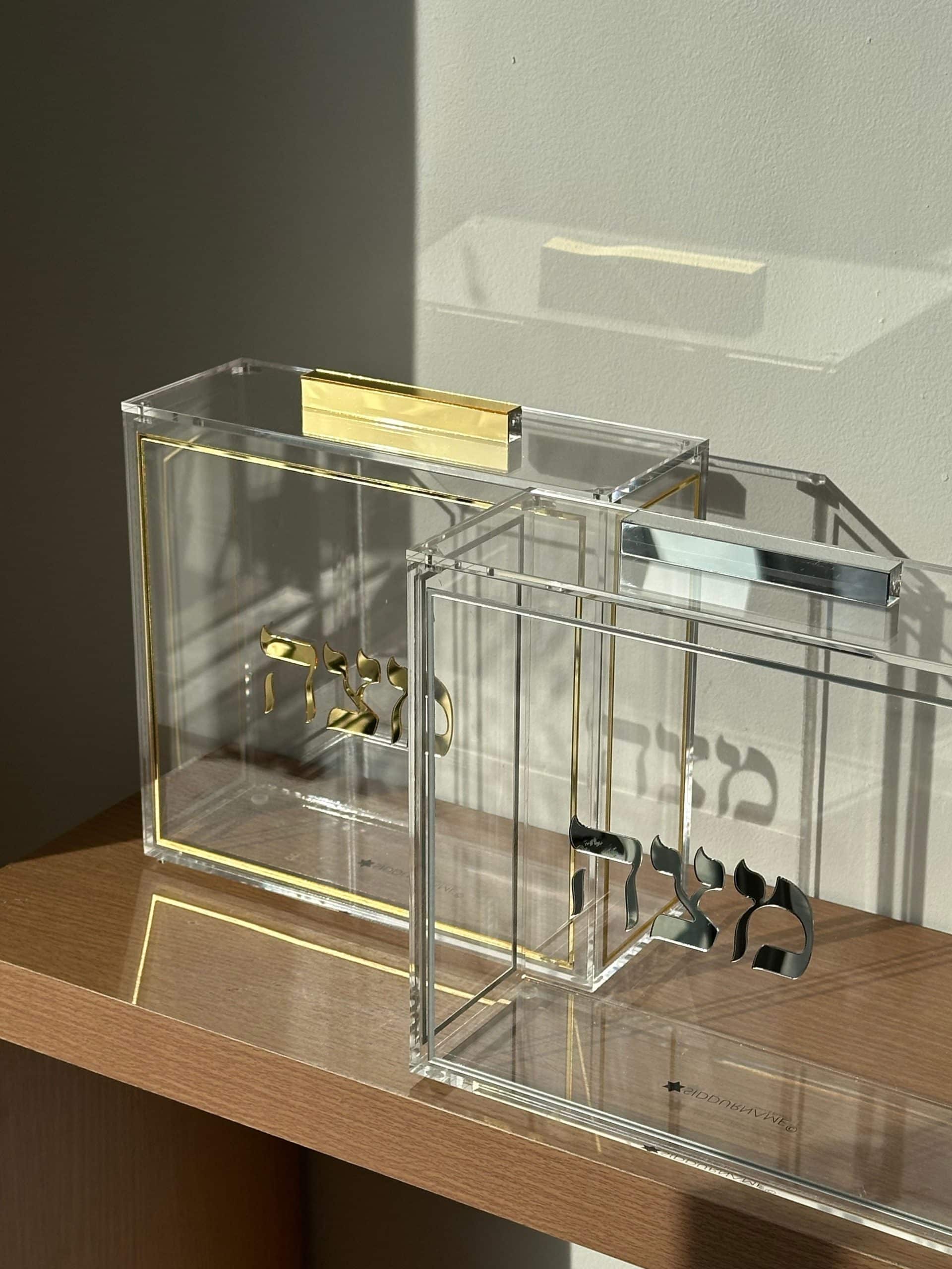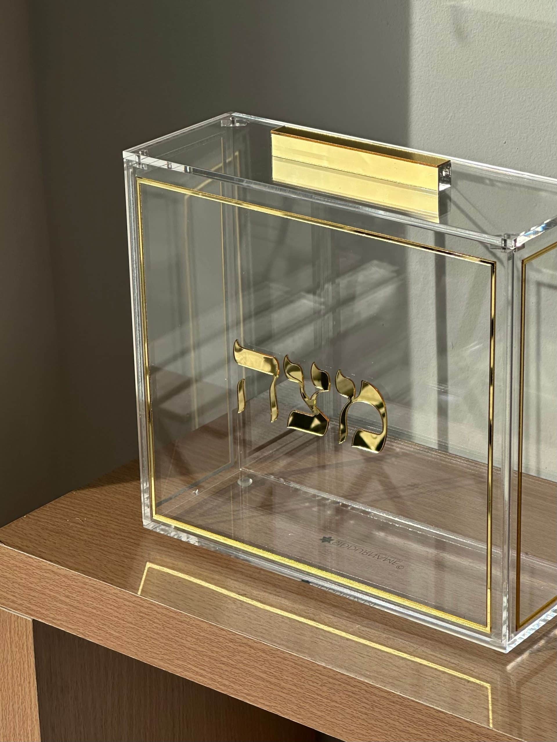 Jerusalem model matzah stand, clean and classic design, gold tone, length 23 cm, width 21 cm.
