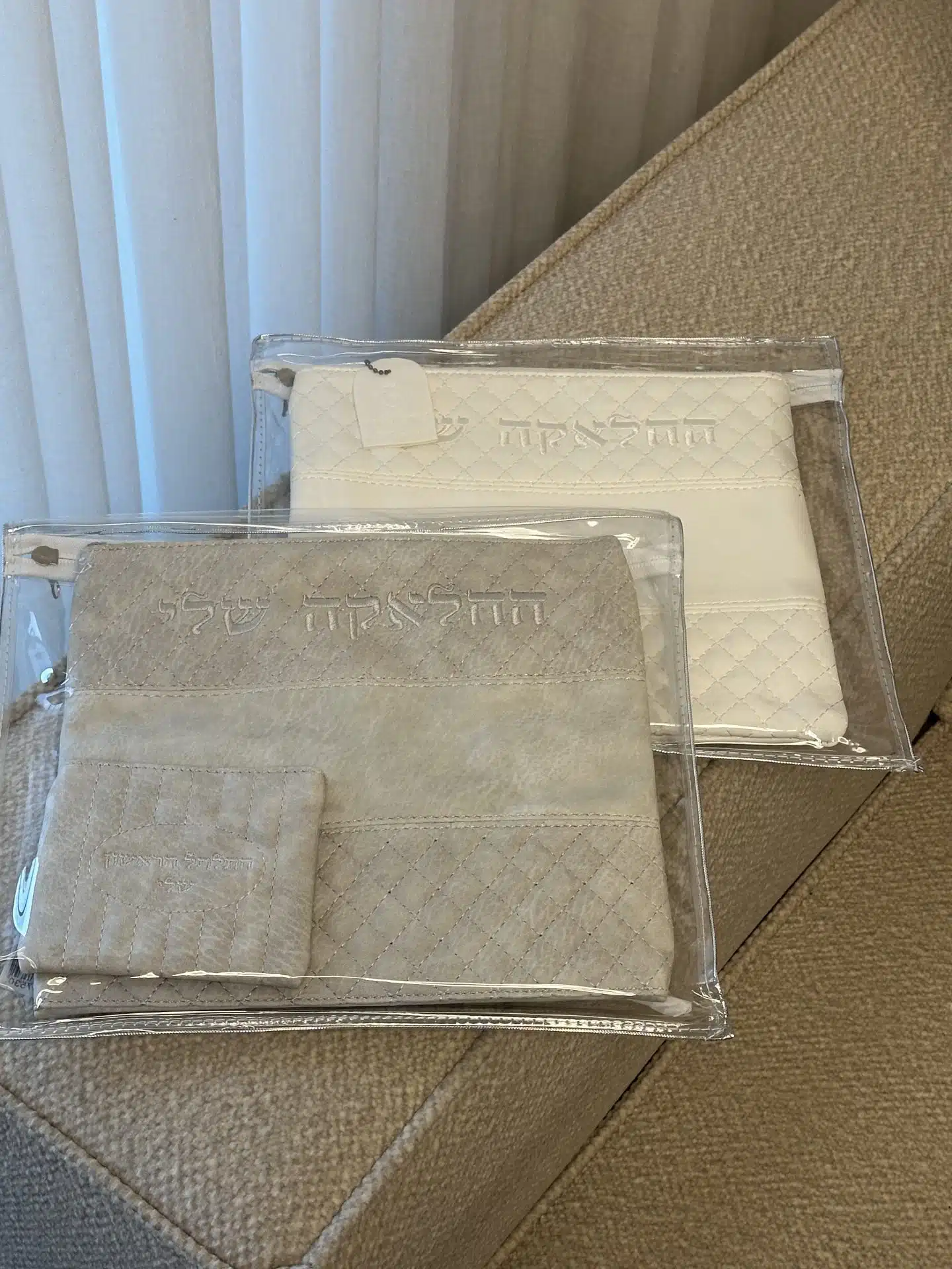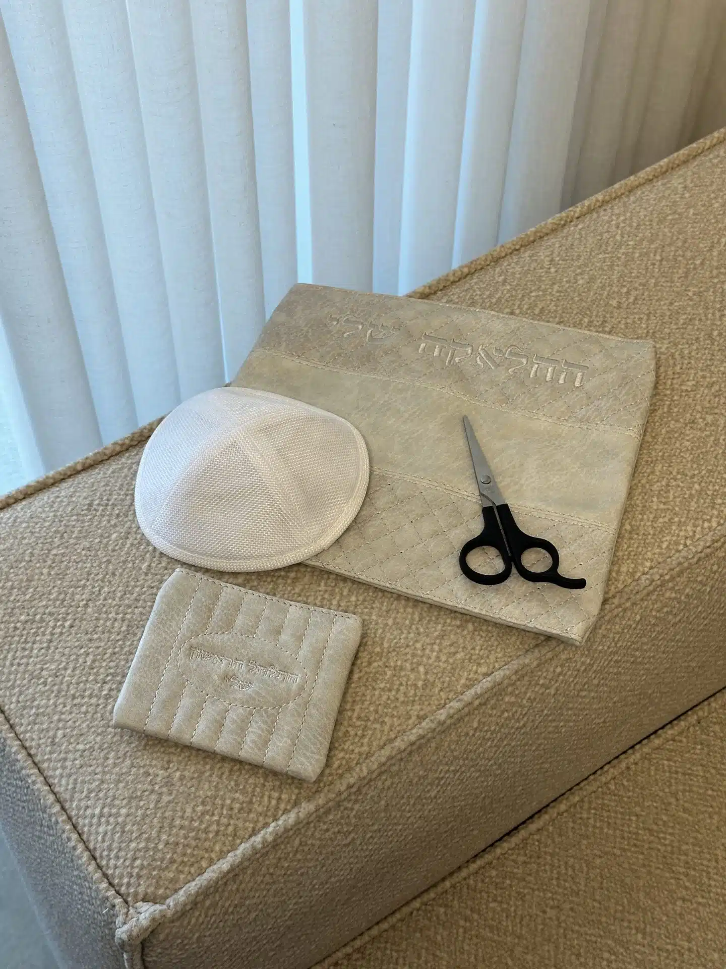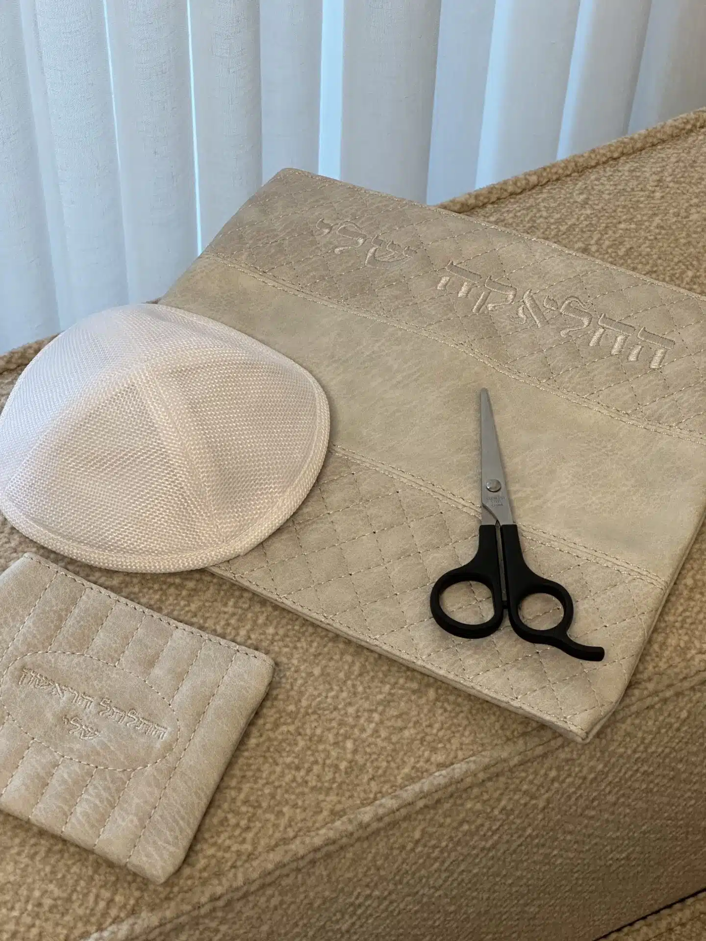 My Halaka Set, gray color, includes a pouch for the hair lock, scissors, and a linen kippah in white.