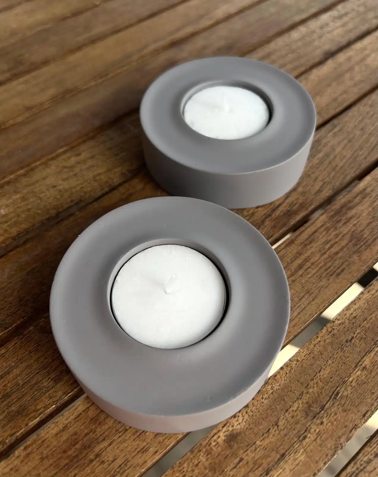 Pair of concrete candleholders, concrete color, diameter 8 cm, height 2.5 cm.