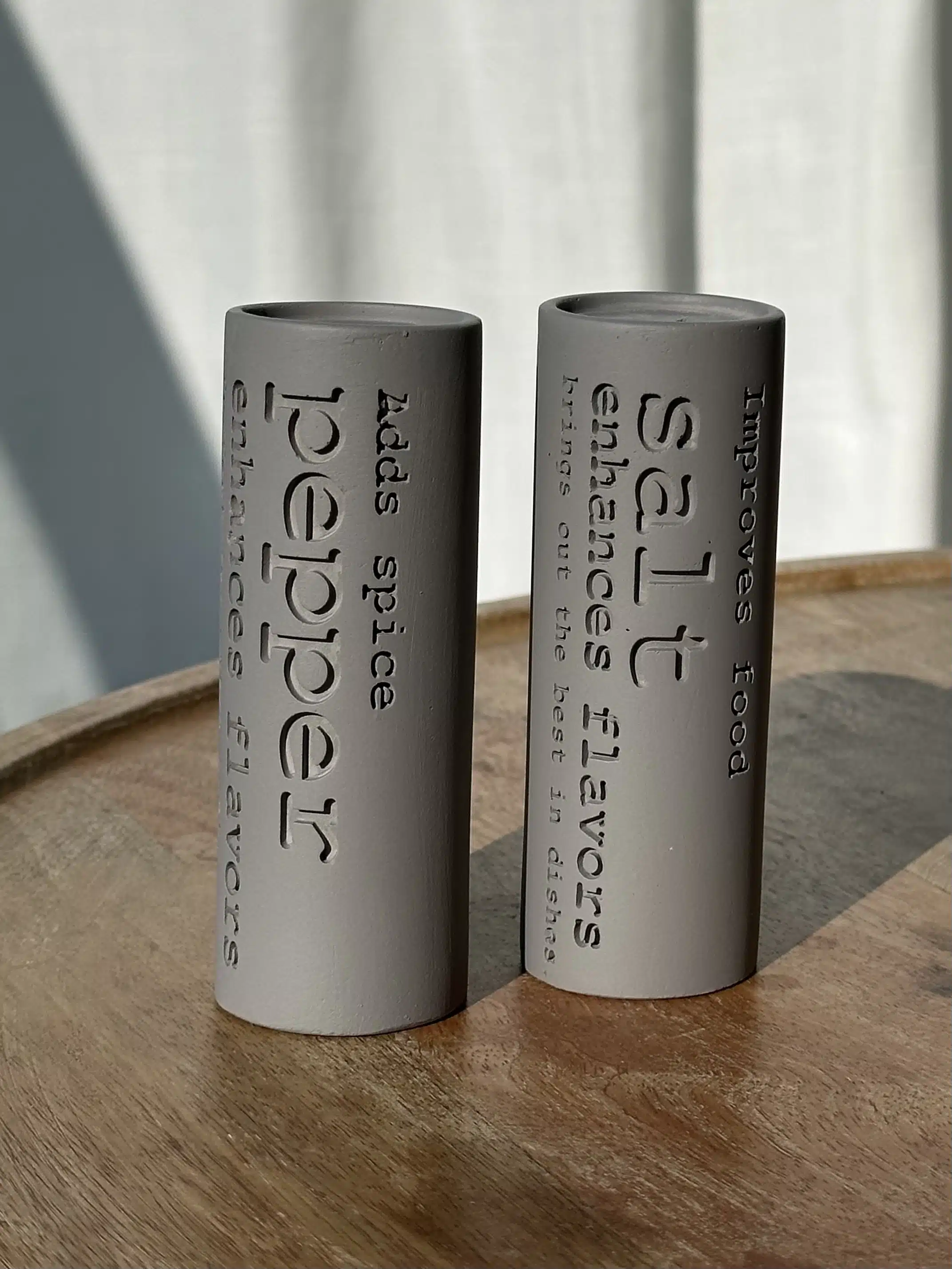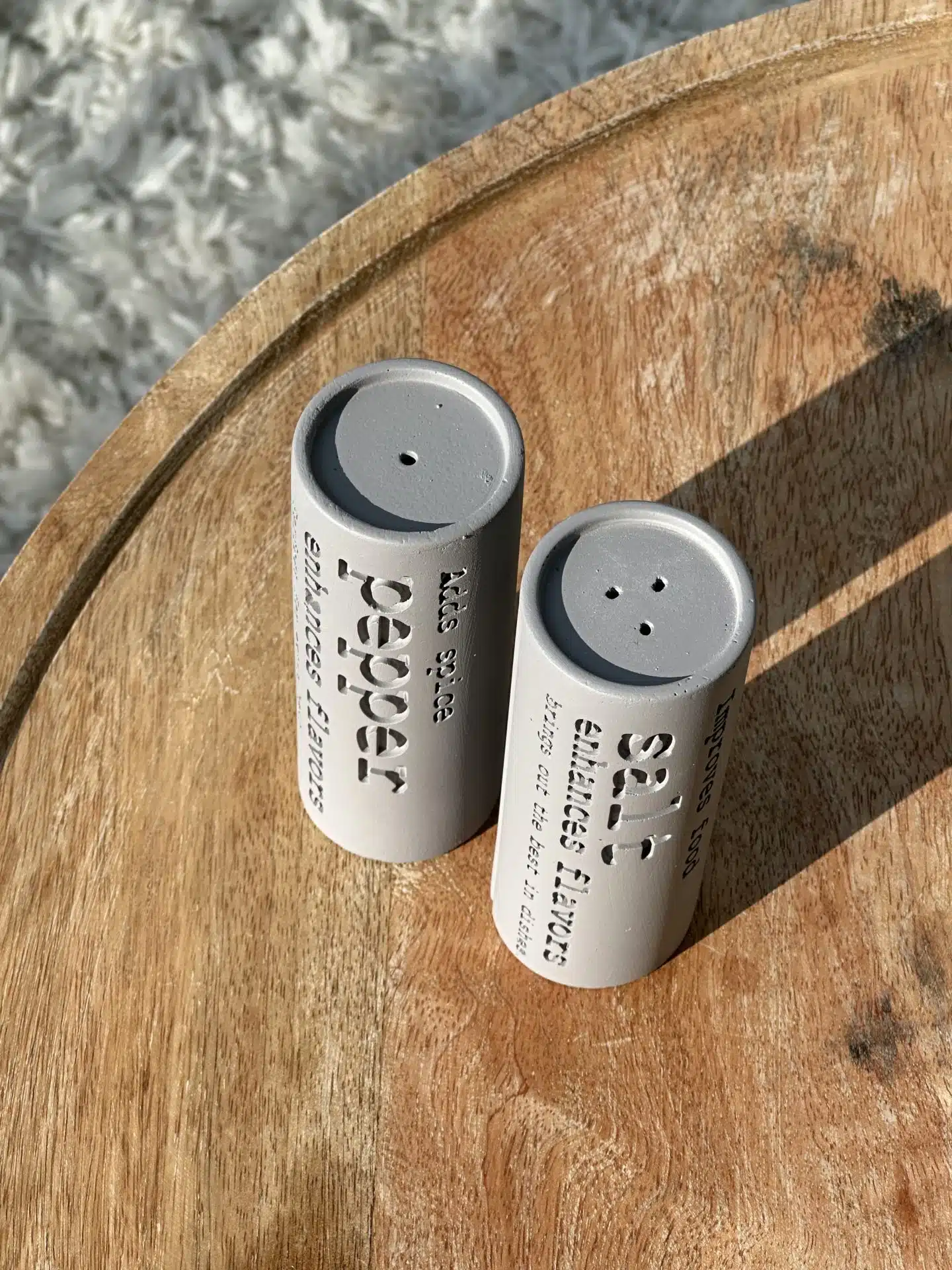 Concrete salt and pepper set, cylinder model, concrete color, length: 11 cm, width: 4 cm.