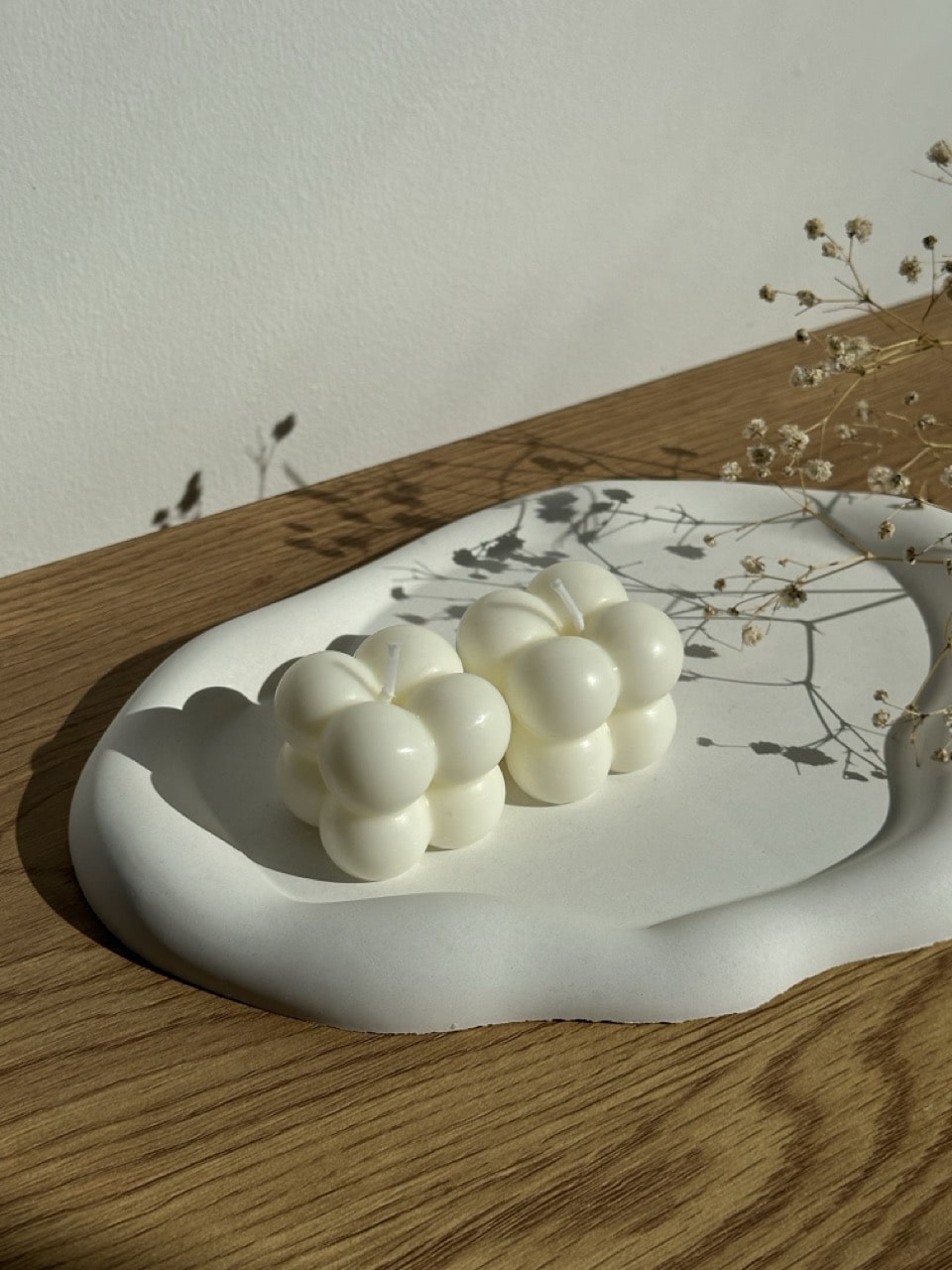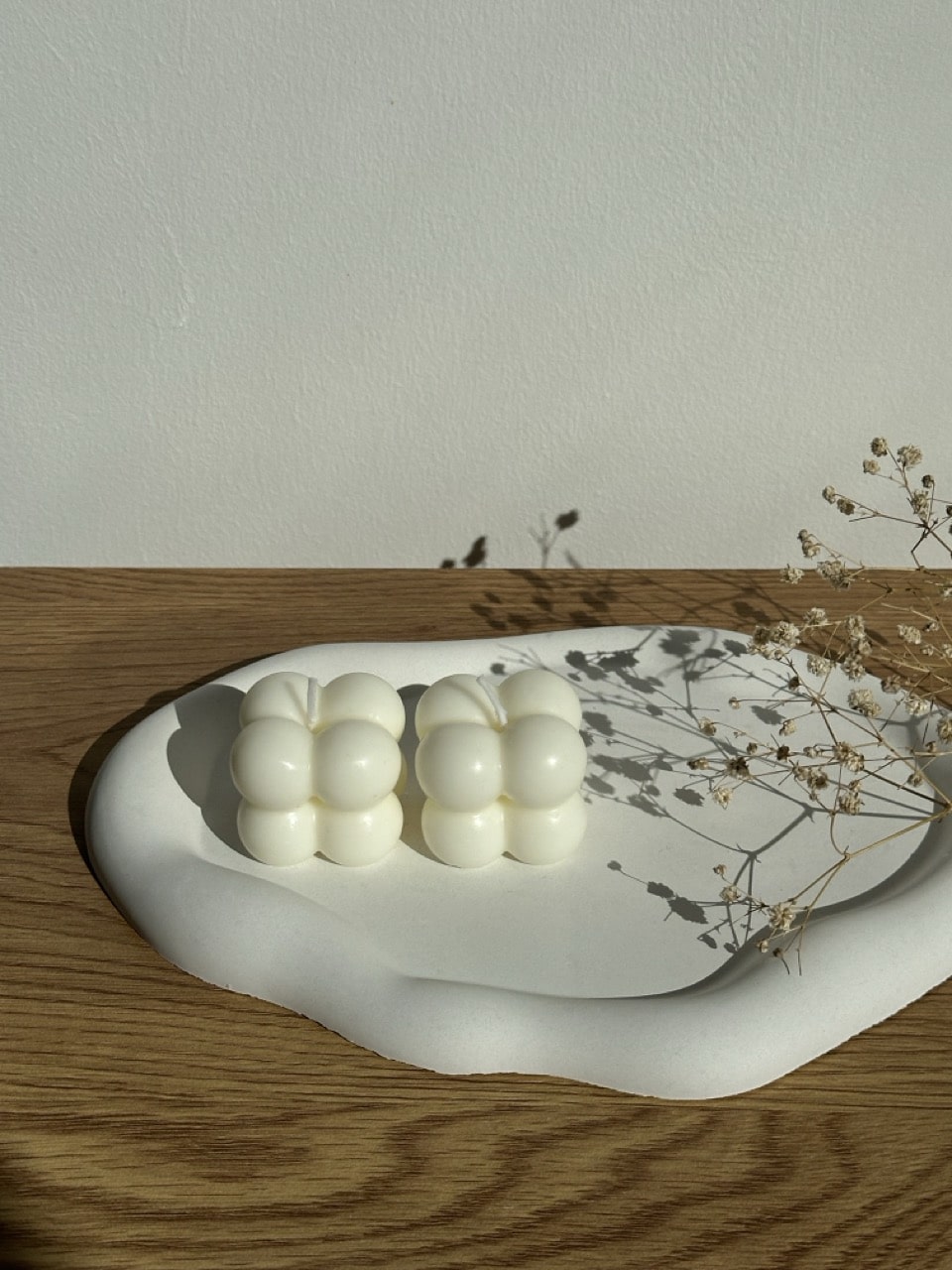 Pair of small scented bubble candles in white color. *Comes without a concrete tray, which can be purchased separately. Height: 4 cm, Width: 4 cm. Fragrance notes: Desert aromas, baby talc, hotel ambiance.