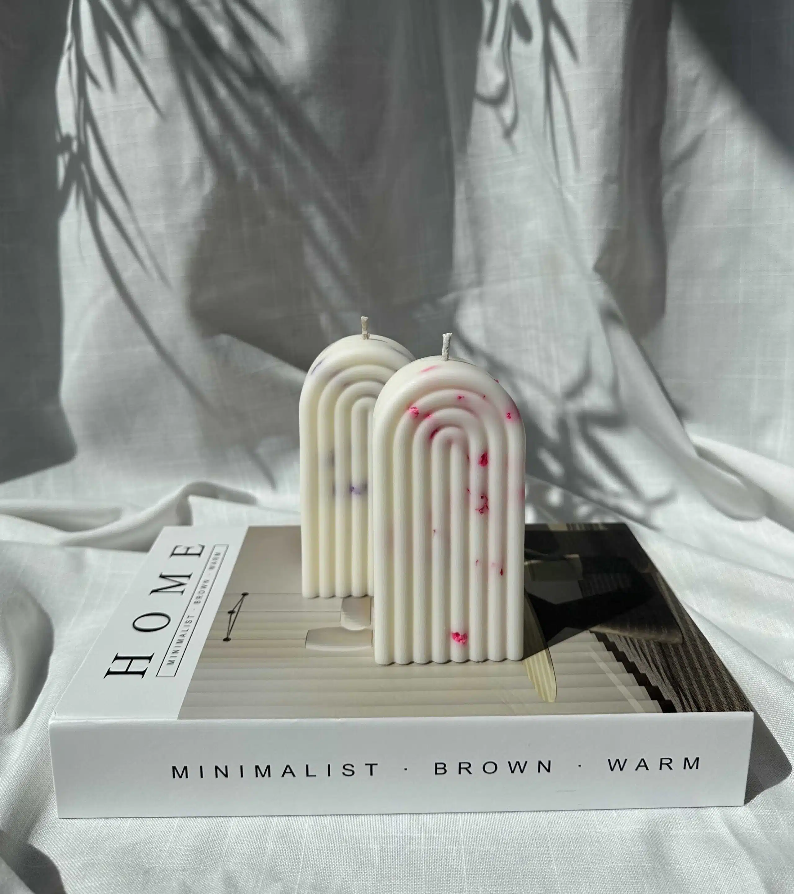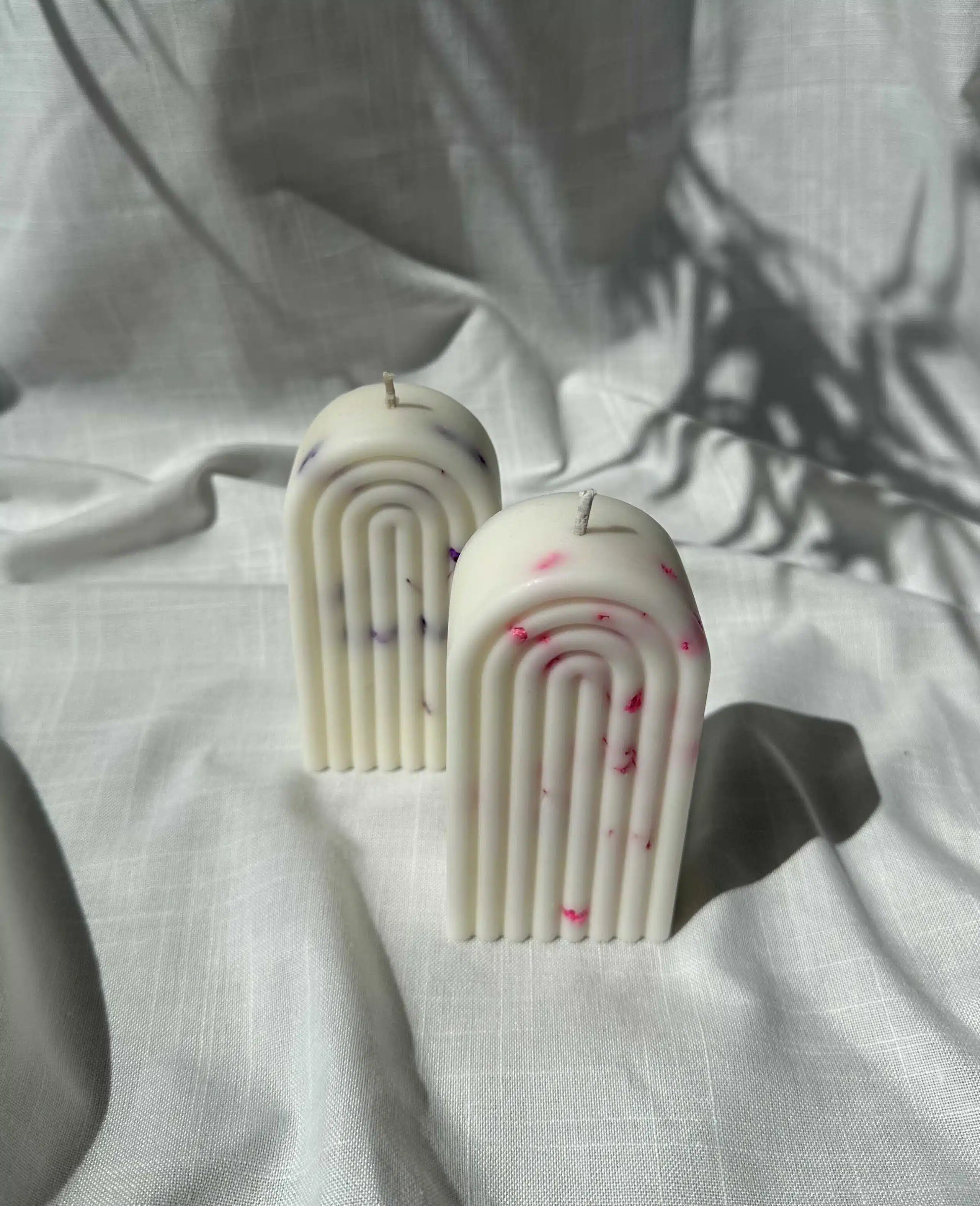 Candles with flowers are decorative and not recommended for lighting due to the dried flowers.