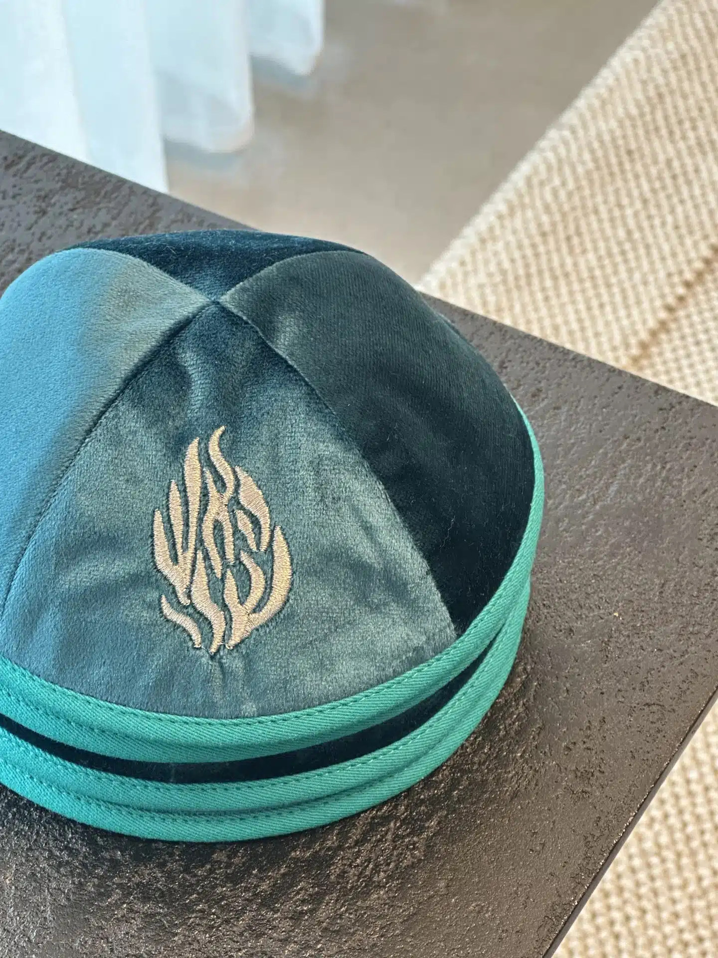 Velvet kippah “My Fire,” turquoise color, 20 cm.